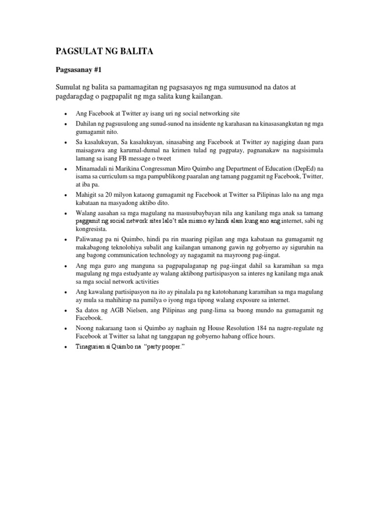 Pasulat ay ipinalimbag sa pahayagan magasin at iba pang babasahin at. Mga halimbawa Huwag gumamit ng pangalan maliban kung kilala ito MaliJaime Diaz nahalal na pangulo TamaMag-aaral ng Mapa nahalal na pangulo ng samahan Maging tiyak specific MaliMag-aaral nagwagi sa paligsahan TamaMag-aaral ng Mapa nagwagi sa pagsulat ng balita Iwasan ang opinyon sa balita MaliPaaralang Datu Puti lumaro ng kahanga. Mahalagang maiparating ang lahat ng mahahalagang impormasyon na may isang limitadong bilang ng salita at upang maibigay ang pinakamahusay na impormasyon sa target.