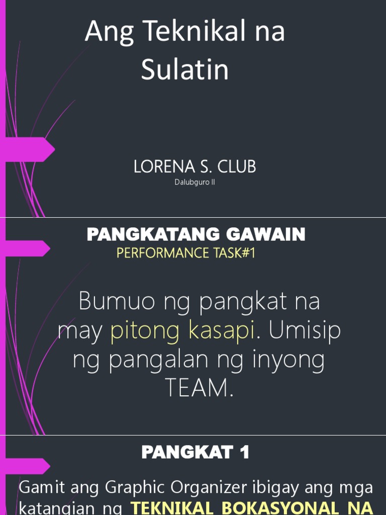 Teknikal na pagsasalin ng teksto. TEKNIKAL NA PAGSULAT MGA HALIMBAWA NG TEKNIKAL NA SULATIN TEKNIKAL Ito ay isang uri ng pagsusulat na magbibigay impormasyon sa pagbuo ng destinasyon o pagbibigay solusyon sa isang komplikadong suliranin. Isang espesyalisadong uri ng pagsulat na tumutugon sa mga kognitiv at sikolohikal na pangangailangan ng mga mambabasa at manunulat.