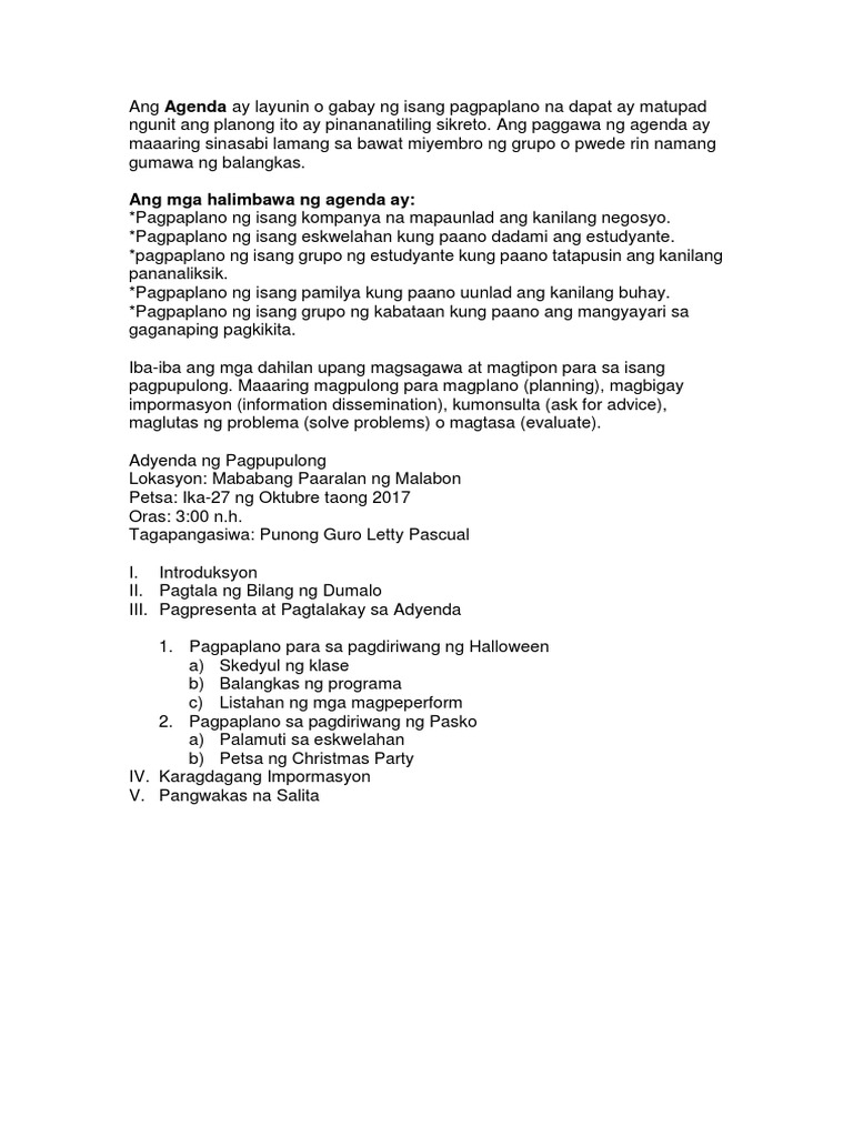 Agenda halimbawa sa pagsulat. Gawin ito sa araw mismo ng pagkakaroon ng desisyon sa petsa at tema upang matiyak na maisasagawa nang maayos ang susunod na pagpupulong at. Ang pagpupulong ay pagtitipon ng dalawa o higit pang indibidawal upang pag-usapan ang mga bagay para sa pangkalahatang kapakanan ng organisasyon o. Katitikan ng Pulong Mula sa isang maayos na agenda maisasagawa ang pulong.