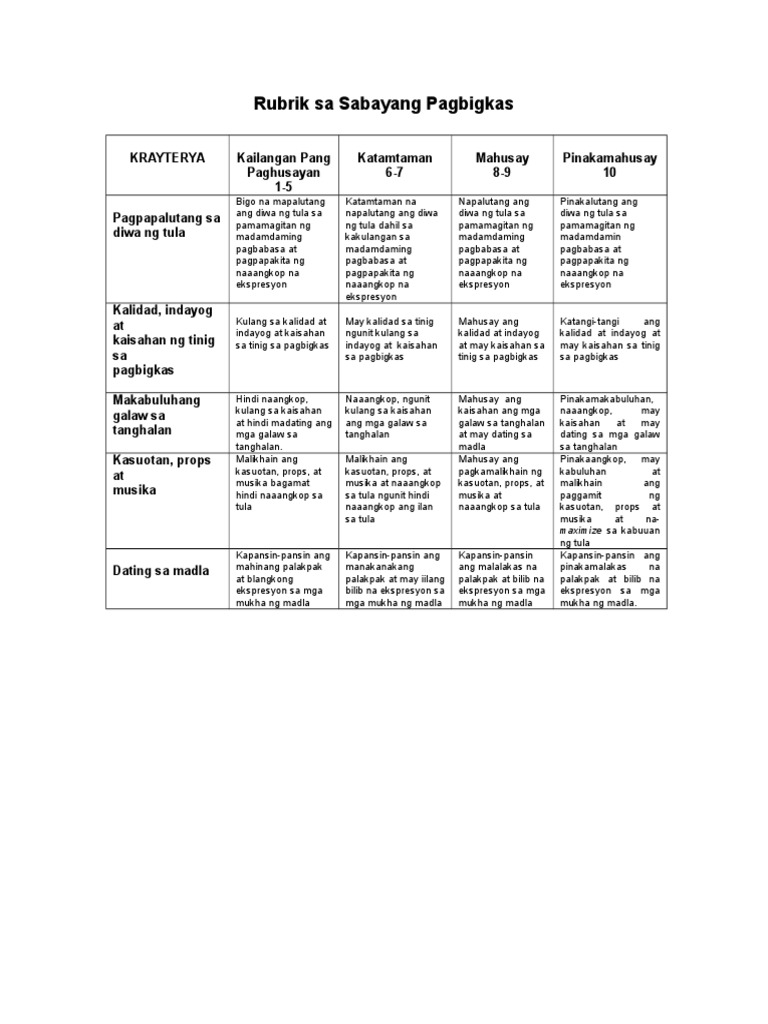 Halimbawa ng rubrics sa dula-dulaan. 27 de agosto de 2014. Ang komite ay magbibigay ng sulating papel bago magsimula ang paligsahan kayat magdala lamang ng panulat.