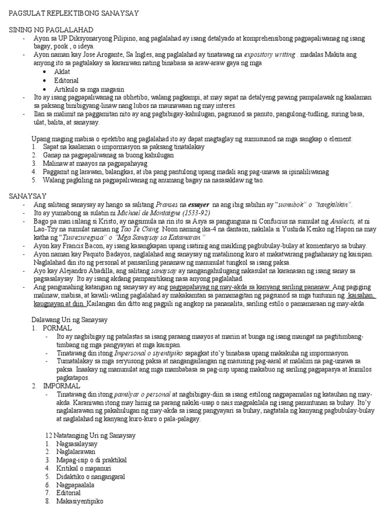 It was a requirement in my Filipino subject where we were asked to write a sanaysay na naglalarawan or descriptive essay in a very detailed manner. Dalawa lang ang sanhi kapag nahihirapan magsulat ng sanaysay. Kaiba sa pagsulat ng talambuhay na tumatalakay sa buhay ng isang tao ang pagsulat ng replektibong sanaysay ay naglalayong bigyang-katwiran ipaliwanag o SUriin ang partikular na salaysay at palutangin ang halaga nito o ang maidudulot nito depende sa layon ng manunulat sa buhay ng tao at sa lipunan Arrogante Golla Honor-Ballena 2010.