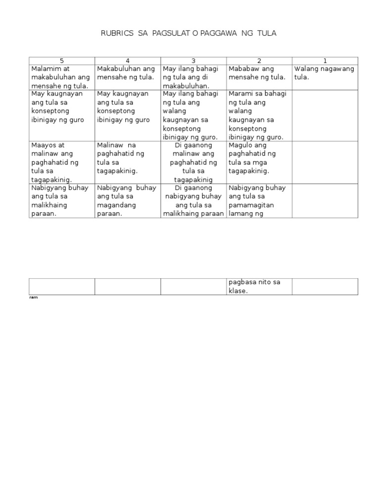 7262019 Rubrics Sa Paggawa Ng Tula 12RUBRICS SA PAGSULAT O PAGGAWA NG TULA5 4 3 2 1Malamim atmakabuluhan anmnah. Wala ni isang pagtatangkang ginawa upang makagamit ng simbolismo.
